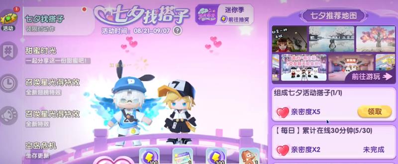迷你世界七夕活动推出了全新的社交互动玩法"七夕找搭子",玩家通过登录游戏、保持在线和探索地图都可以增加与好友的亲密度,当亲密度达到一定数值后可以兑换专属称号"xx的小宝贝"和"发射爱心"互动动作,这些特别道具非常适合在花海大厅或者搭子房中进行拍照留念。