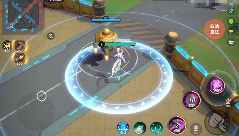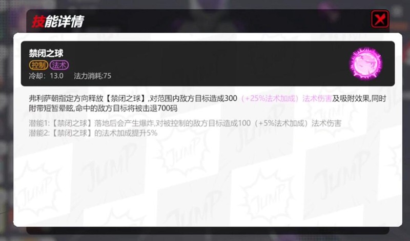 禁闭之球是弗利萨的主要控制技能,冷却时间为13秒,法力消耗为75。该技能向指定方向生成黑洞球体,对范围内的敌人造成300(+25%法术加成)法术伤害,并附带吸附效果和短暂僵直,命中后还会将敌人击退700码。潜能1可使技能命中后追加伤害,潜能2则提升基础法术加成。该技能适合用于先手开团,将敌方分散单位聚拢,便于后续AOE技能打出范围伤害。同时,击退效果还能打断敌方关键技能或阻止刺客切入,是构建控制链的重要一环。