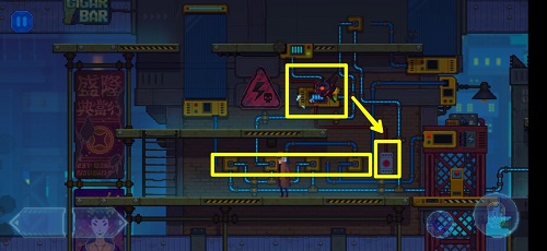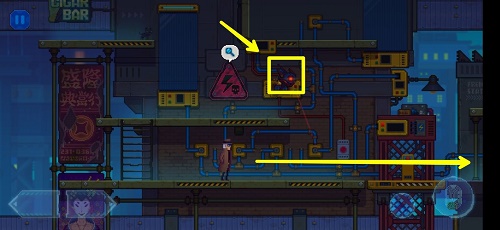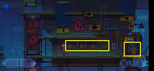 跟在他屁股后面冲到右边打开发电机,注意不要太快了碰到激光,然后如法炮制冲回左边
