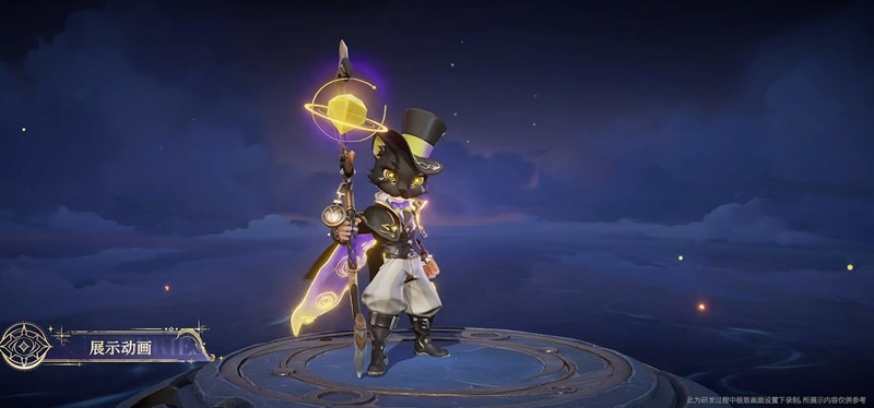 服饰设计上,鬼谷子戴上了猫猫头套,披肩小西服保留了克莱恩服饰的深邃华丽特征,同时适配了猫猫的可爱形象。手持蒸汽朋克风格的权杖,核心是一颗黄水晶,可用于占卜,周围还悬挂着各种齿轮零件和怀表。