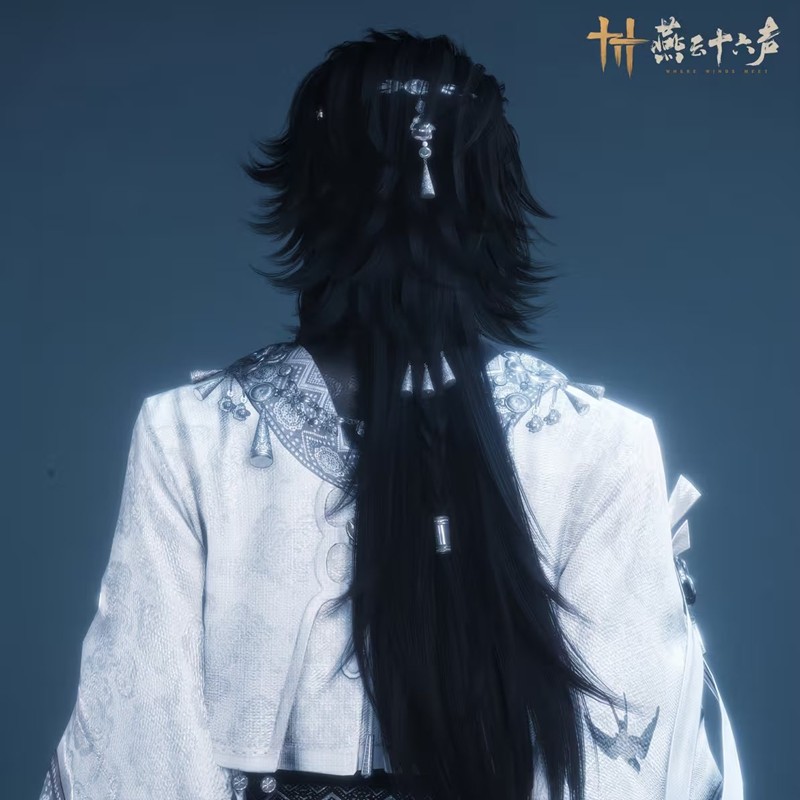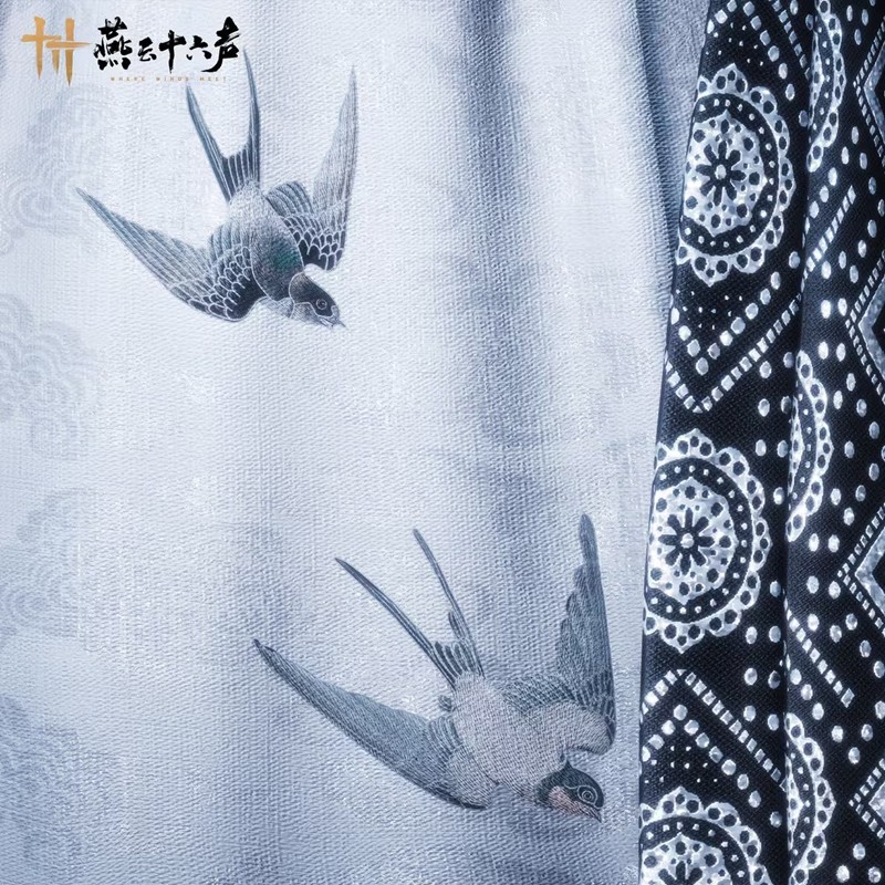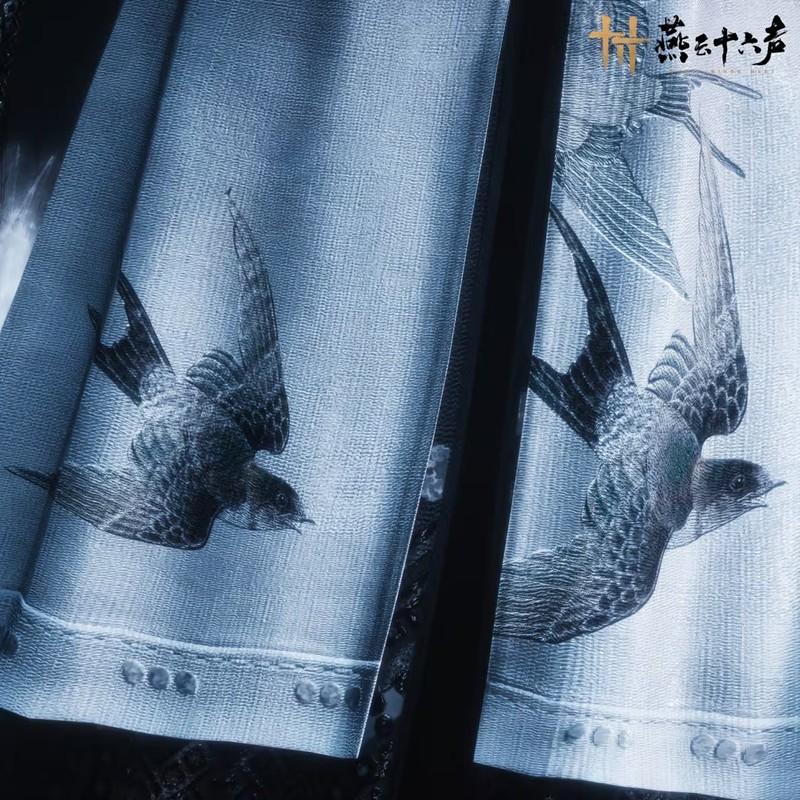 衣袍以白黑为主色,外袍如月光倾泻,图腾纹饰点缀其间,更有墨色飞鸟振翅欲飞,栩栩如生。月光扫过,方见银漪般的典雅暗纹,倒似半卷未展的书画,只待有心人看破那一绢千工的玄机。