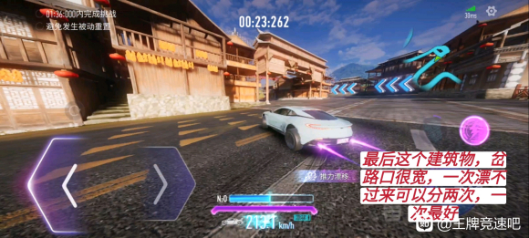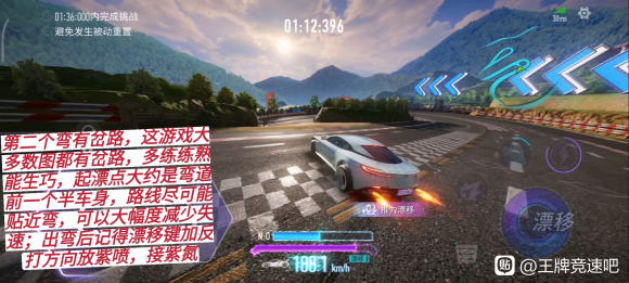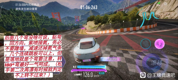 第二个弯有岔路,这游戏大多数图都有岔路,多练练熟能生巧,起漂点大约是弯道前一个半车身,路线尽可能贴近弯,可以大幅度减少失速;出弯后记得漂移键加反打方向放紫喷,接紫氮。