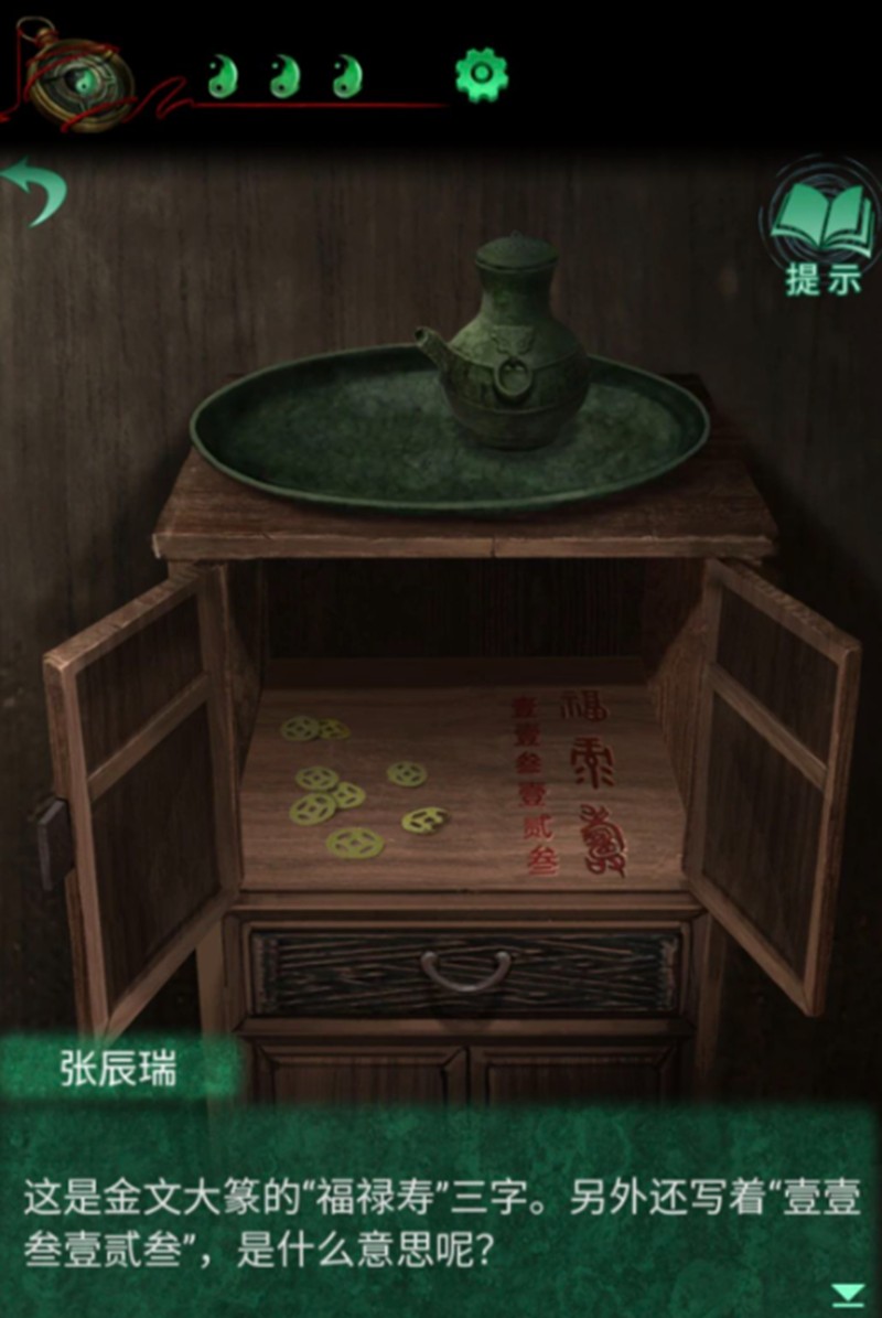 在进入院子后,玩家需要先调查右侧的柜子。柜子上刻有金文书写的"福禄寿"三个字,旁边还标注着"113123"这组数字。这个线索是解开棺材谜题的关键所在,玩家必须牢记这组数字的排列顺序。
