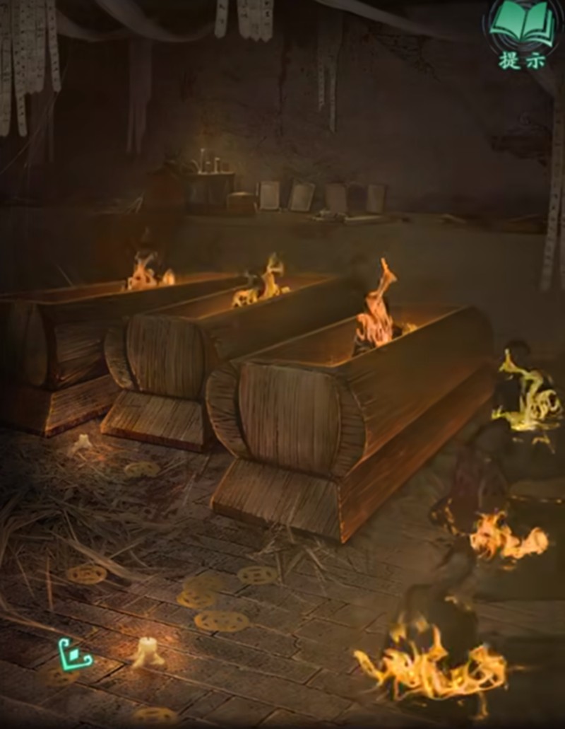 当玩家按照正确顺序敲击后,棺材就会自动打开。此时可以看到里面的纸人,它们会在棺材开启的瞬间被火焰烧毁。完成这个解谜后,玩家就能获得关键道具,顺利推进剧情发展。