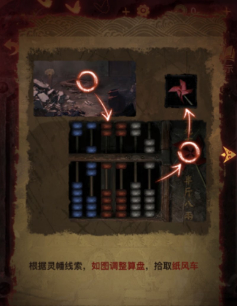 算盘机关采用16进制计数方式,需要根据灵幡数量来调整珠子位置。具体操作时要从右往左数:第一列3个灵幡对应3个珠子,第二列9个灵幡对应9个珠子,第三列11个灵幡需要放1个珠子并进位1个,第四列7个灵幡对应7个珠子,第五列5个灵幡要放5个珠子并进位1个,第六列没有灵幡则不放珠子。成功调整后可以获得纸风车道具。