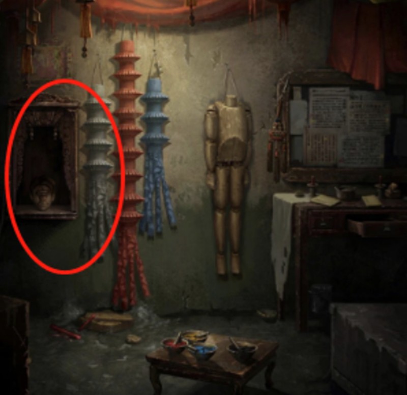 乱石旁的火盆点击后会得到纸灰,而右上角的洞口处则悬挂着关键的灵幡线索。这些灵幡实际上是解开算盘机关的重要提示。