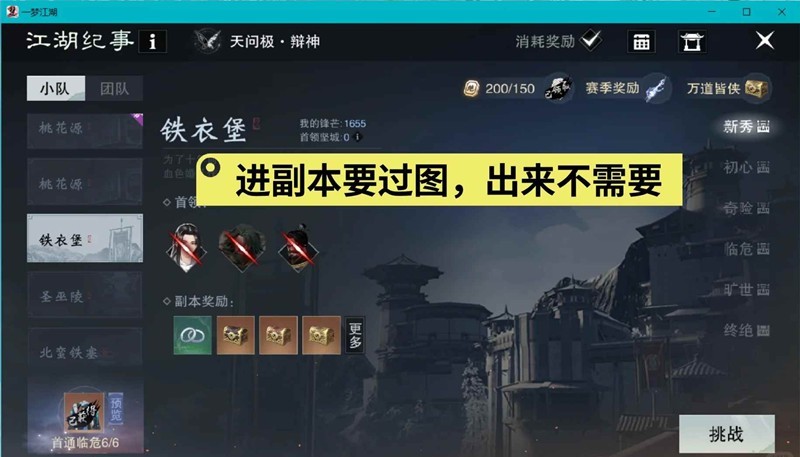 在塞北这个大地图内,进入铁衣堡副本需要等待过图页面,出副本则不需要。不在出本也需要等过图页面加载!