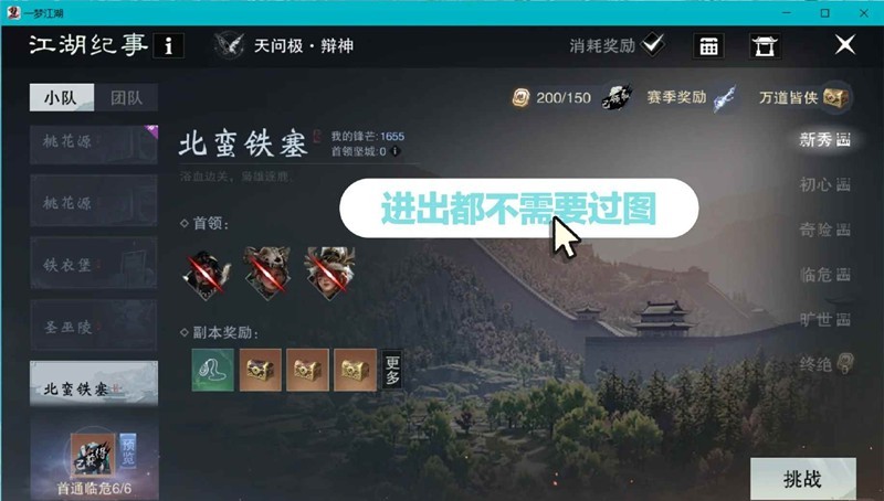 在居庸关大地图内,进出副本都不需要等待过图页面加载!但是如果不在居庸关,就都需要加载咯。