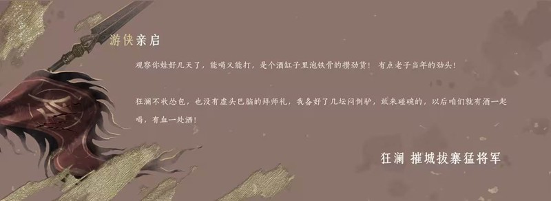 说到豪情,就不得不提狂澜弟子以酒为命的传统,入门后自当与众同门纵情豪饮不醉不休。酒至酣处,便狂态毕现,如猛虎出闸,似怒龙掀浪。