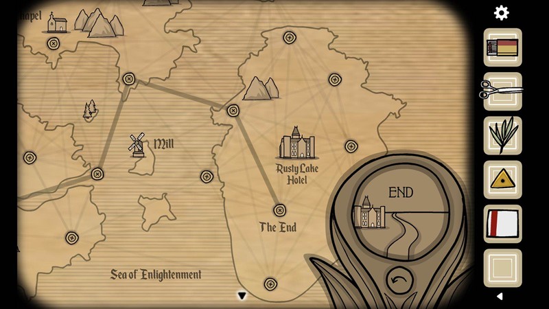 当放大镜显示正前方有山群时,表示是从海上到达陆地,需要选择对应的前进方向。特别需要注意的是,往下走时左右方向是相反的,这一点很容易混淆。第二章的地球仪谜题虽然增加了更多建筑物作为干扰,但基本解法与第一章相同。