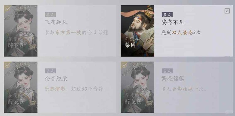 2.完成3次门派号令涨90进度值,推荐做三个任务,F2看报和古琴完成飞花逐风和余音绕梁,多人合影拍照去多人世界拍一张就行.