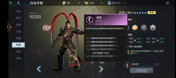吕布战中骁勇另敌人胆寒,周围为的敌人造成的伤害降低4%,受到的伤害增加4%。