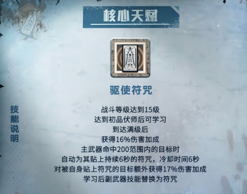 驱使符咒是伏师的核心天赋,使用后副武器技能会被符咒替代。当符咒命中200范围内的敌人时,会自动附着在目标身上持续6秒,冷却时间同样为6秒。这个技能让伏师在战斗中能持续保持输出优势。