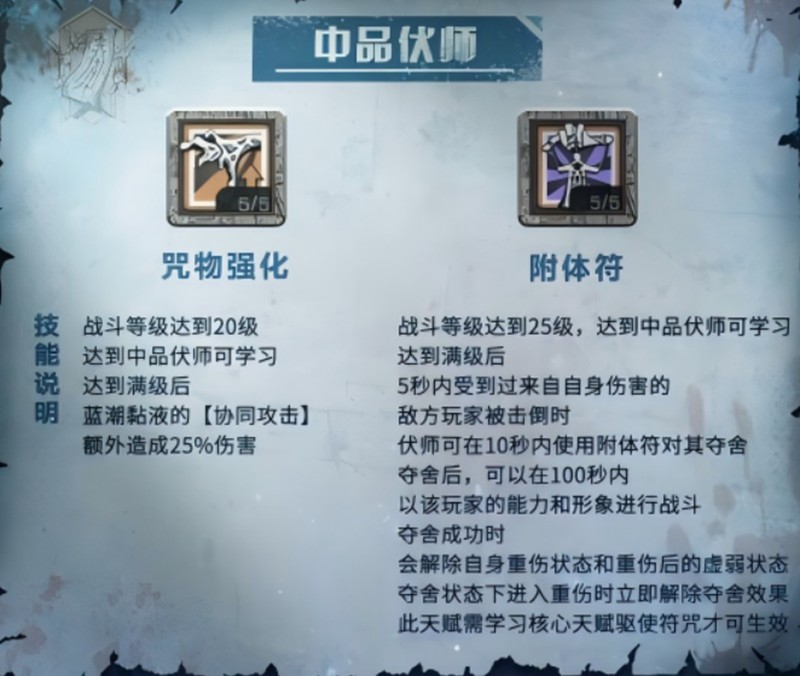中品伏师阶段,咒物强化提升了蓝潮黏液的协同攻击伤害,额外增加25%伤害值。附体符则让伏师可以附身在被击倒的敌人身上,不仅能使用敌人的能力,还能解除自身的虚弱状态。