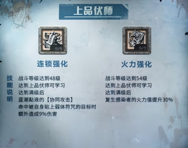 上品伏师阶段,连锁强化让蓝潮黏液的攻击附带弱体符咒效果。火力强化则提升了复生感染者的火力值,使召唤物的战斗力更加强大。
