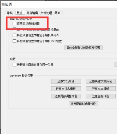 3、在打开的窗口界面中,点击上方中的"预设"选项卡,然后找到下方中的"应用自动色调调整",将其小方框勾选上即可