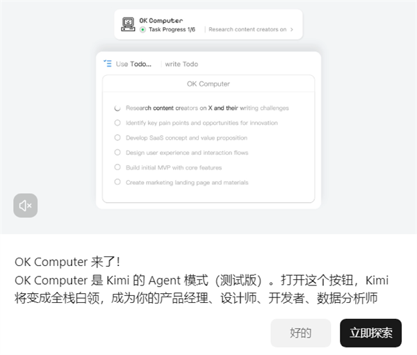 其中OK Computer是今天发布的全新Agent模式,用户下达需求后,Kimi可操作自身的虚拟电脑,完成各种复杂任务。