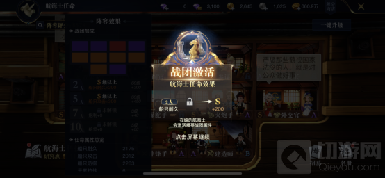 游戏前期航海士属性加成可能并不是很明显,但来到中期就会显得非常重要。增加输出类型的航海士,可以让船只战斗更加强势。贸易类型属性加成,提高我们贸易币获取的速度,这个也是非常关键的。因此,游戏中期除了通过各类任务获取皇家招募信外,还可以通过神秘商店购买68元档礼包,获取5个皇家招募信和航海士经验书,再从大事件UP招募里,抽取指定的航海士,以便快速补充航海士阵容,当S级以上航海士达到指定数量,还可以激活战团额外属性加成。最后利用经验书,对任命的航海家进行单个提升等级,确保经验书最大化利用。