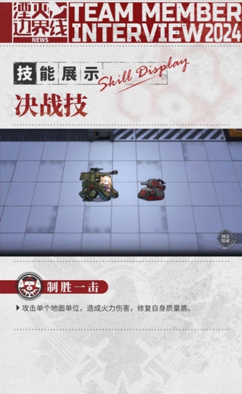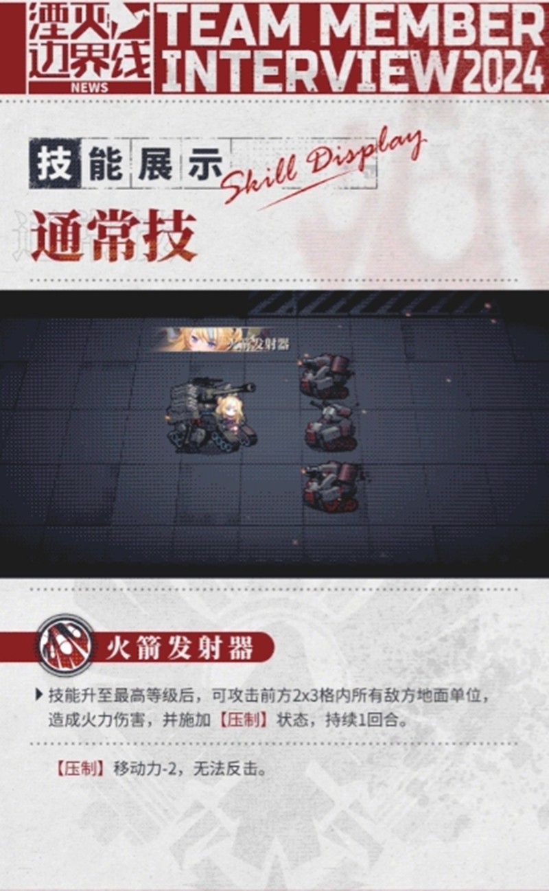 潘兴的决战技制胜一击需8次充能释放,对单个地面目标造成175%的火力伤害,并修复自身20%的质量盾。配合黑桃杰克特性,当她处于援护状态并分担伤害时,决战技额外获得1点充能,加快大招循环节奏。通常技则能对前方2x3格内的敌方地面单位造成60%火力伤害,并施加压制状态,使其移动力减少2点且无法反击,持续1回合,有效限制敌方行动。