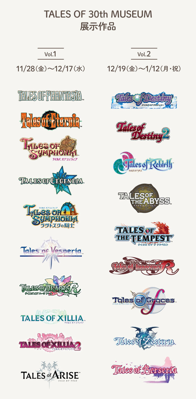 在漫长的日本游戏历史上,经典知名系列RPG中,万代南梦宫《传说》系列绝对数得上号,万代南梦宫日前宣布,备受粉丝期待的《传说》系列30周年纪念大会“TALES OF 30th MUSEUM”将于11月28日开幕,一直持续到2026年1月12日,新旧游戏集结,敬请期待。