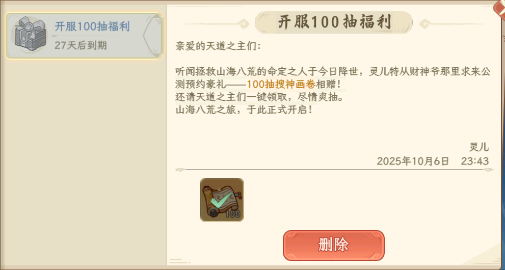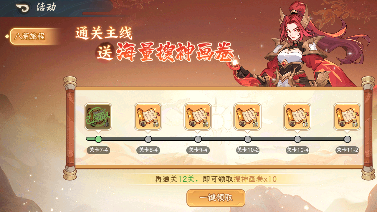 活动说明:通关主线2-4解锁邮件功能可直接领取搜神画卷*100,开服第8天起每日可领取搜神画卷10连。