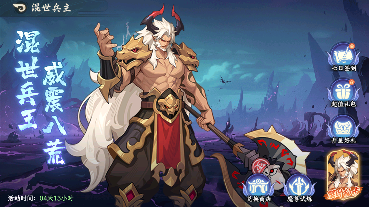活动说明:活动期间,传说橙色英雄蚩尤获取概率大幅提升。具体活动内容可在游戏内活动【混世兵主】查看。