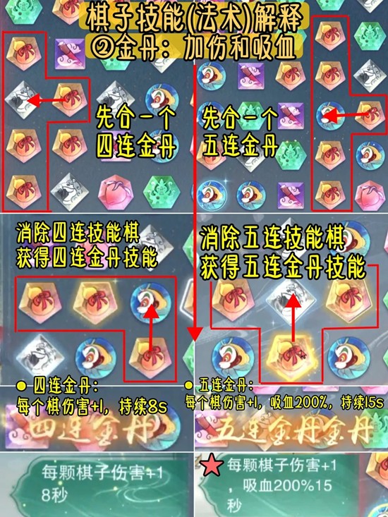 回血法术:四连桃子+100,五连桃子+25%,五连金丹按棋子伤害吸血200%