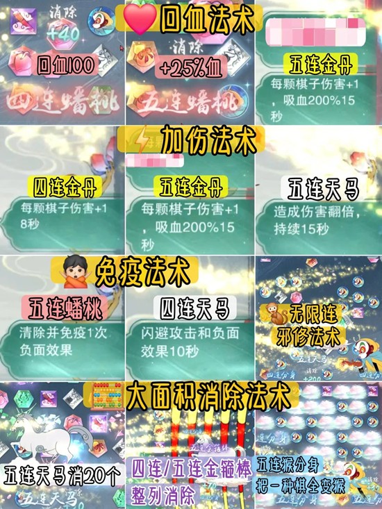 ②从上面法术分类里可以看出,不同情况下这些法术的效果的强弱和持续时间各有不同,比如单论增伤方面,五连马伤害翻倍很强,而大面积消除时刷金丹的性价比也很高