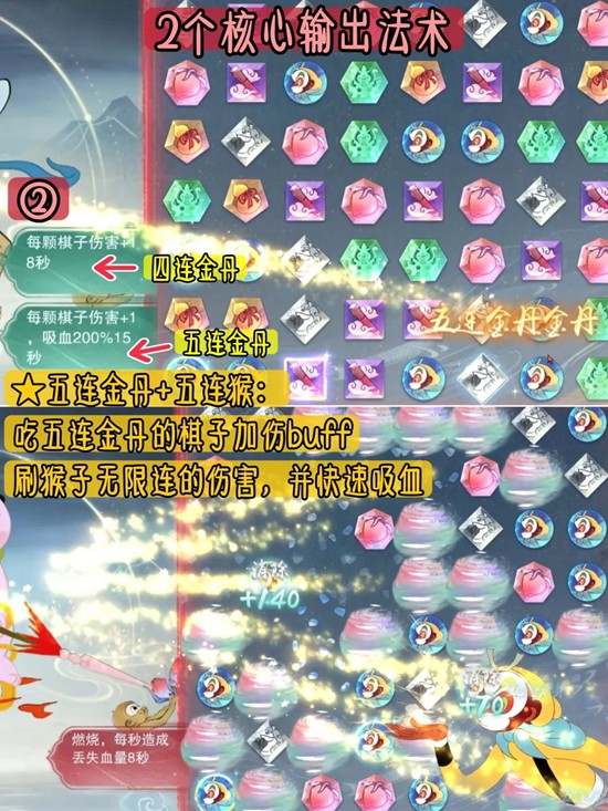 五连金丹+五连猴:吃五连金丹的棋子加伤buff,刷猴子无限连的伤害,并快速吸血