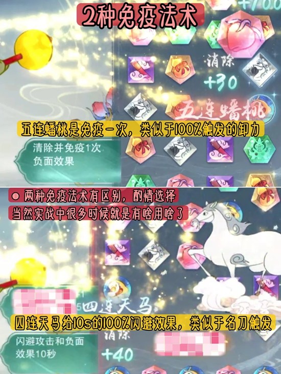 五连蟠桃是免疫一次,类似于100%触发的卸力。四连天马给10s的100%闪避效果,类似于名刀触发