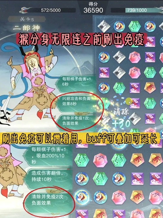 猴子无限连之前可以停下来看看有没有其他五连,一是叠buff加伤回血,二是刷免疫天眼,否则猴子太快清屏棋盘又变成随机了