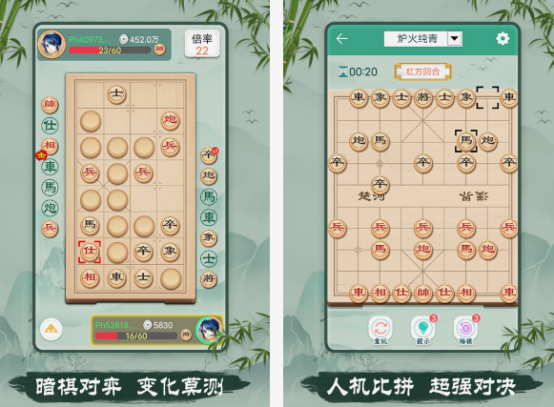 在玩象棋的时候,也是通过一人一半屏幕的方式进行体验,无论你代表的是哪一个阵营的,都需要在下棋的时候,根据这种棋类的走子规则,然后利用对方每次走棋的一些规律观察局势,顺利的完成走子的任务。有精美以及简约的游戏画面,还能在这里面自由的选择不同的背景,无论是与现实生活中的好友展开较量,或者是人机比拼,都要展现出实力才能取胜。