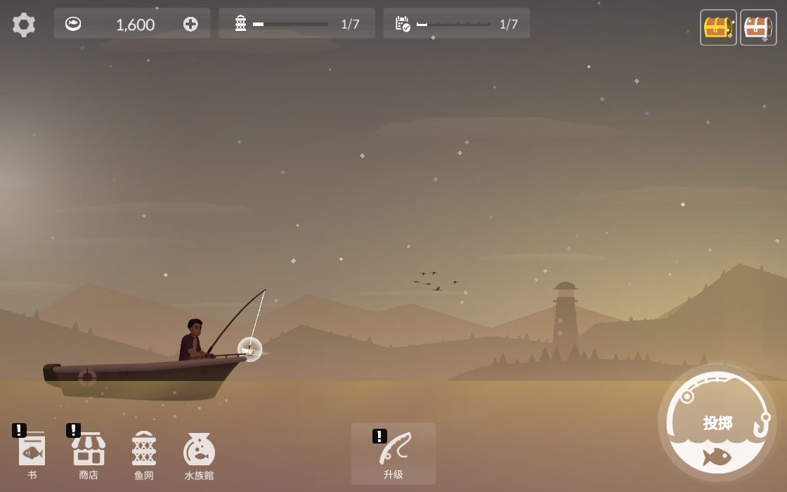 一个休闲钓鱼的治愈手游,玩家可以滑动屏幕控制船只选钓点抛竿,鱼上钩之后根据鱼的挣扎力度调收线节奏,游戏设计了上百种鱼,不同鱼的习性、活跃时间和对应的鱼饵都不一样,而且游戏里的动态天气、昼夜也会影响鱼的活跃度,钓上来的鱼可以放入水族馆观赏。游戏没有时间压力加上剪纸风格的画面和海浪声、鸟鸣等自然音效,钓鱼的沉浸感很强。