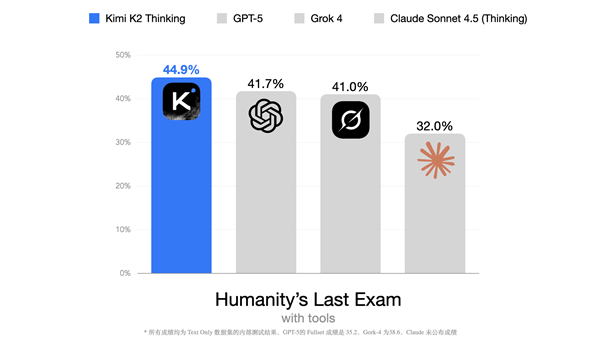 在允许使用工具——搜索、Python、网络浏览工具的同等情况下,Kimi K2 Thinking在这项基准评测中取得了44.9%的SOTA成绩。