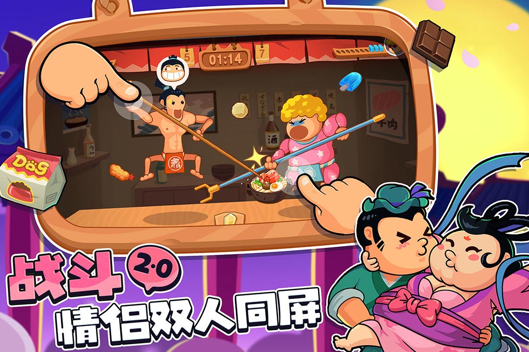 一款轻松搞笑的双人竞技手游,玩家操控角色利用长杆将掉落的食物戳向对方,目标是让对方饱腹值达到上限从而获胜。食物分为不同热量等级,高热量食物可更快提升对手的饱腹进度。游戏设有休闲模式与排位赛制,支持同屏对战或邀请好友联机。角色形象多样,包括孙悟空、兔女郎等,随着进食逐渐变胖,表情夸张有趣,整体氛围极具娱乐性。