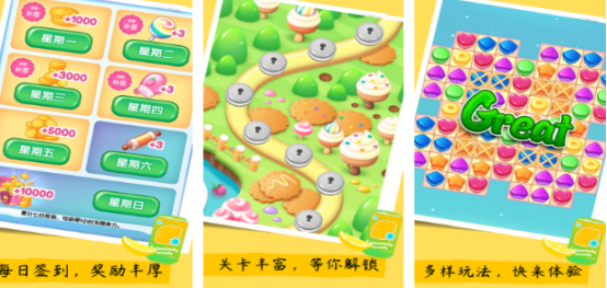以缤纷甜点为主题的三消游戏,采用三种模式交替进行关卡挑战。每日更新任务并推送限时活动,完成目标后可赢取大量金币奖励。虽然规则看似简单,但高阶关卡需要充分运用策略才能顺利通关,适合追求解谜深度的玩家。