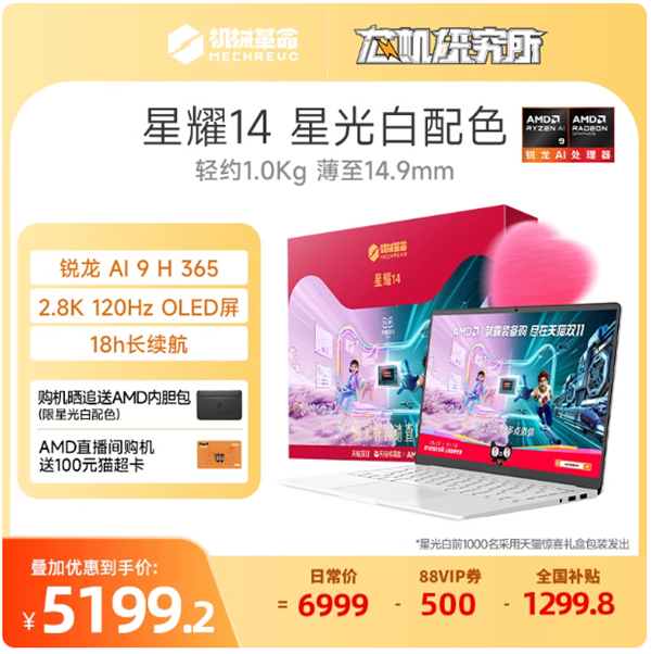 其实在轻薄本里星耀14的性价比已经拉满,还有着轻靓搭子的美誉。现在AMD直播间购机送100元猫超卡,购机星光白配色晒单还送AMD内胆包。当然还有搭载锐龙7 H 255处理器的入门款机型可选,机械革命笔记本的性价比,实在是逆天。