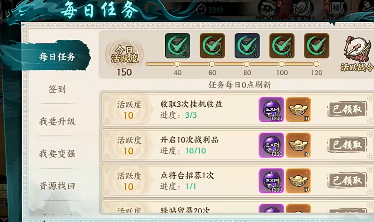 除了通过消耗时间来挂机外,完成每日任务里的各项内容也能让各位获取一定的经验资源,同时还能拿到元宝等较为重要的资源,但要注意不是每项任务都会给经验,因此各位在冲级时可优先去做那些给经验的任务,且每天都要将它们完成,让自己在开荒过程中能更快完成等级提升,否则就会损失这方面带来的经验收益。此外,在完成每日任务时各位也能顺道完成各副本的战斗任务,它们同样也有经验奖励,还能拿到各种材料。
