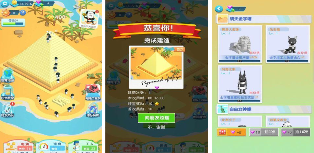 本作采用竖屏操作模式,便于单手游玩。玩家将在有限空间内完成各类建筑搭建任务,包括普通房屋以及世界著名地标。每次建造完成后可记录耗时并分享成果,已建成的地标还可作为旅游景点运营,持续带来经济回报,实现建造与经营的双重满足。
