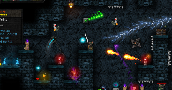 进入游戏后,你会来到一个地牢里,里面有好多怪物等着你来打。刚开始的时候,你的武器可能不太厉害,不过没关系,打怪物的时候会掉一些装备,换上新装备后,打怪物就会轻松很多。地牢里还有很多房间,每个房间里的怪物都不一样,有的怪物跑得很快,有的怪物会发射东西攻击你。你要小心避开怪物的攻击,然后趁机反击。有时候还会遇到宝箱,打开宝箱能得到很多好东西。