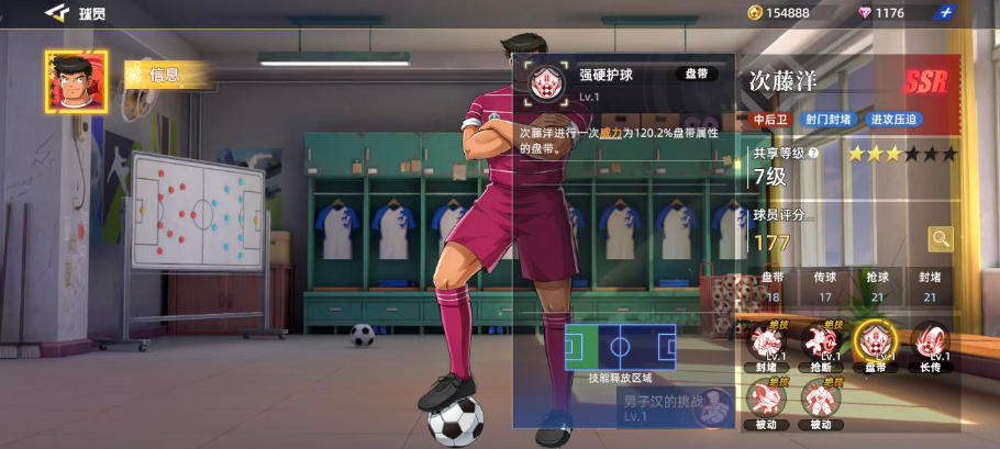 根据强力压迫这个技能的效果,在次藤洋自身的封堵属性上面还可以增加2.8%的数值之后,只要次藤洋发动强力挡球技能,此时对手的控制值日过是低于509的话,那么这个被动则会带来本次封堵威力增加的增益,根据增益这里会有5.7%的封堵属性进行提升,最后在男子汉的挑战技能当中一开场大家就可以获取一定的增益,次藤洋一开场就能拿到3层【战利品】的状态加成,这个加成一旦施加在次藤洋身上就可以持续生效整场比赛,且在叠加到5层的时候数值更高,而且如果是次藤洋发动强力挡球技能失败的时候,根据这个技能的效果此时如果我方门将体力值低于5%的话,次藤洋就可以消耗掉自身之前积攒的3层战利品状态,来为我方门将恢复体力,其中每一层的战利品都是可以给我方门将回复4.4%体力数值的。