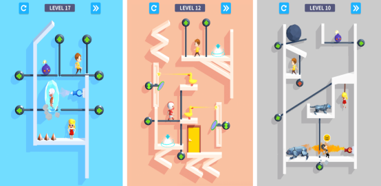 游戏以简洁画风呈现,主角被困在由多个拉环构成的机关系统中,每个拉环拉动后都会引发连锁反应。操作时必须谨慎规划顺序,避免触碰炸弹、陷阱或怪物等危险元素。关卡数量庞大,难度逐级上升,考验玩家的空间预判与策略安排能力。