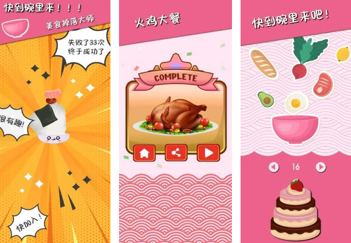 这款游戏采用了独特的物理下落机制,所有食材均以掉落形式出现。玩家需通过滑动和点击屏幕,调整接取位置与角度,确保食材准确落入碗中。只有成功收集足够原料,才能进入下一步的料理制作环节。玩法新颖,考验反应力与手眼协调能力。