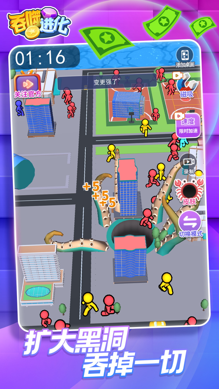 《吞噬进化》以“黑洞”为核心设定,初始阶段仅是一个微小的引力点,通过不断移动并吞食周围物体来壮大自身。从街头小物件到整座城市的建筑乃至巨型怪物,皆可纳入囊中。随着体积增长,黑洞的吞噬范围和能力也随之增强。玩家将在动态竞技场中与其他黑洞展开对抗,争夺最强吞噬者的称号。
