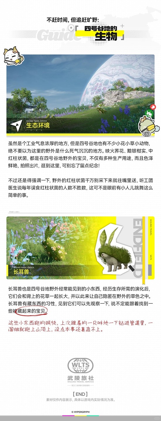 虽然是个工业气息浓厚的地方,但是四号谷地也有不少小花小草小动物,绝不要以为这里的野外是什么死气沉沉的地方。映火养花、黯银柑实、中红柱状菌,都是在四号谷地野外的宝贝,不仅有多种生产用途,而且色泽鲜艳,拍照出片,逛到这里,可别忘了留点纪念!