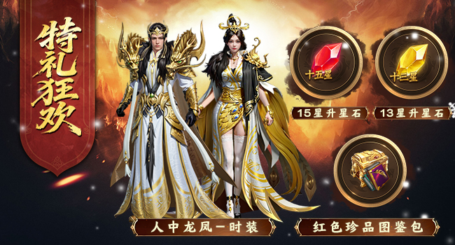 参与活动便有机会获取15星升星石,13星升星石,红色珍品图鉴包以及珍稀可进阶时装——人中龙凤!