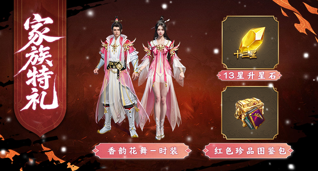奖励满满来袭,征途融融暖意!全家族收集特礼积分激活奖励,参与活动全家族可获取13星升星石,红色珍品图鉴包以及珍稀返场限定时装——香韵花舞!!