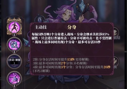 每隔5秒召唤1个分身,继承美杜莎的属性,仅普攻不释放技能,战场上最多同时存在3个,分身最长存活20秒。分身可以分担美杜莎承受的伤害,最高90%!