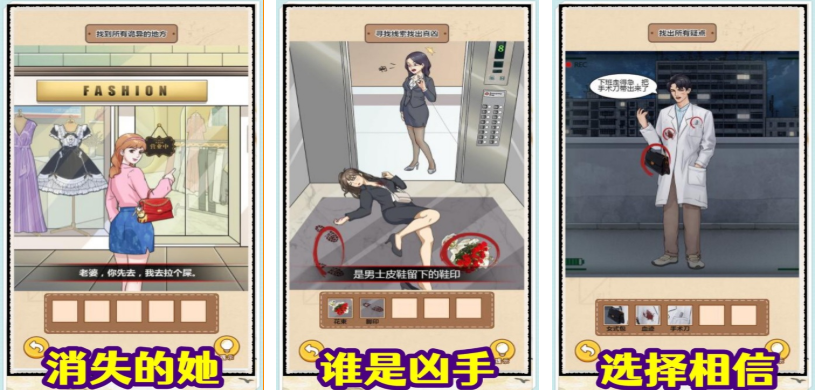 本作是根据消失的她电影开发的竖屏操作解谜小游戏,将破案解谜跟规则怪谈的玩法深度结合,出场NPC很多也能带来扑朔迷离的解谜气氛,各种扑朔迷离的案件设定也会让游戏更显神秘,地图上各种道具林立可以随意组合参与任务,基础的规则怪谈的任务体系并没改变也会让玩家脑洞大开,你能根据规则怪谈的提示快速寻找凶手吗。