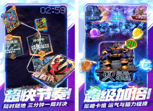 作为大家非常喜欢,根据漫威中熟悉的人物所打造的对战题材手游,还加入了卡牌玩法,通过上千种不同的流派,需要凭借着策略卡牌这方面所具备的实力,展开运气与烧脑之间的较量。还具有超快的节奏,随时随地都能参与三分钟一局的对决,通过携带12张卡牌的方式,就可以加入到6个回合之间的较量,游戏操作方式非常简单,还支持双方之间的相互试探。
